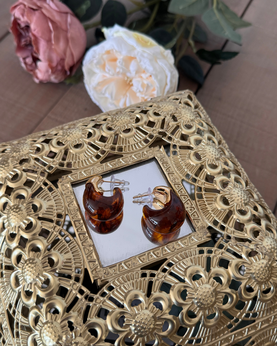 Pendientes en forma de aros en carey. No pesan nada y favorecen muchísimo. Un “must have” para tus looks más casual.